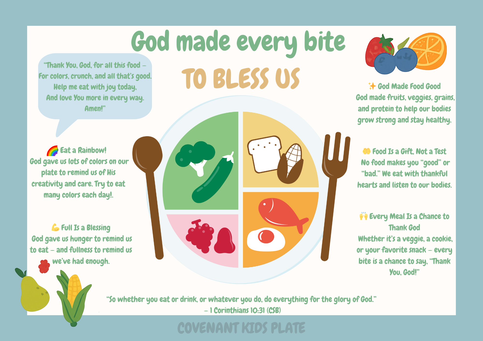 The Covenant Kids Placemat is a simple, faith-filled tool to help children understand balanced eating through a biblical lens. Designed for ages 3–9, it uses the plate method to encourage kids to fill their plates with nourishing foods — while also reminding them that food doesn’t define their worth.